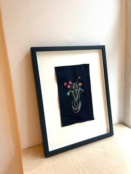 Media: Embroidery on dark blue Kvadrat textile. Embroidery thread and wool yarn.Framed in a handpainted petroleum blue solid wood frame at Atelier Hjorth-Rohde